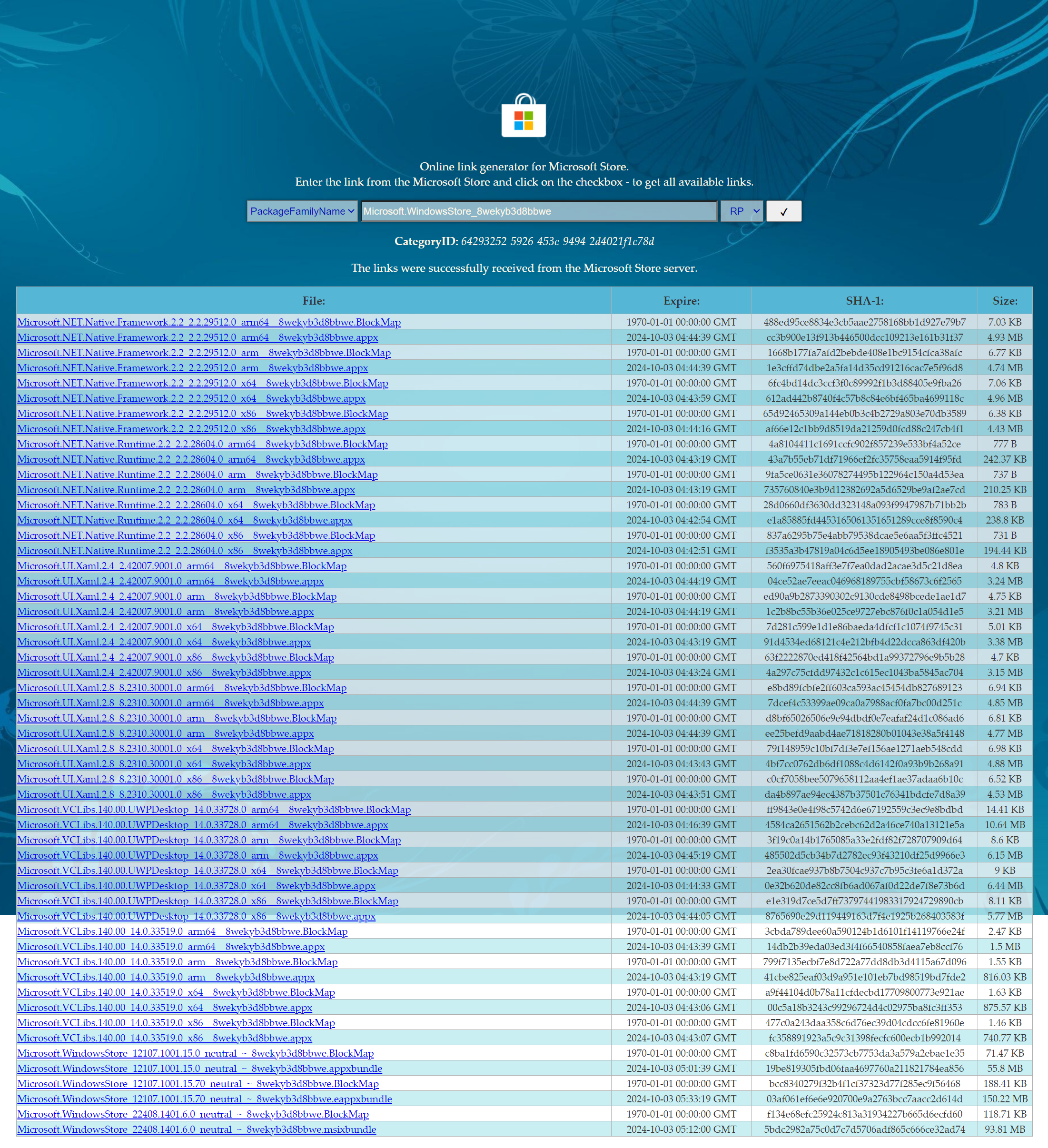 打开 下载网站,以 PackageFamilyName 搜索 Microsoft.WindowsStore_8wekyb3d8bbwe,并下载最新的Microsoft Store的相应软件包