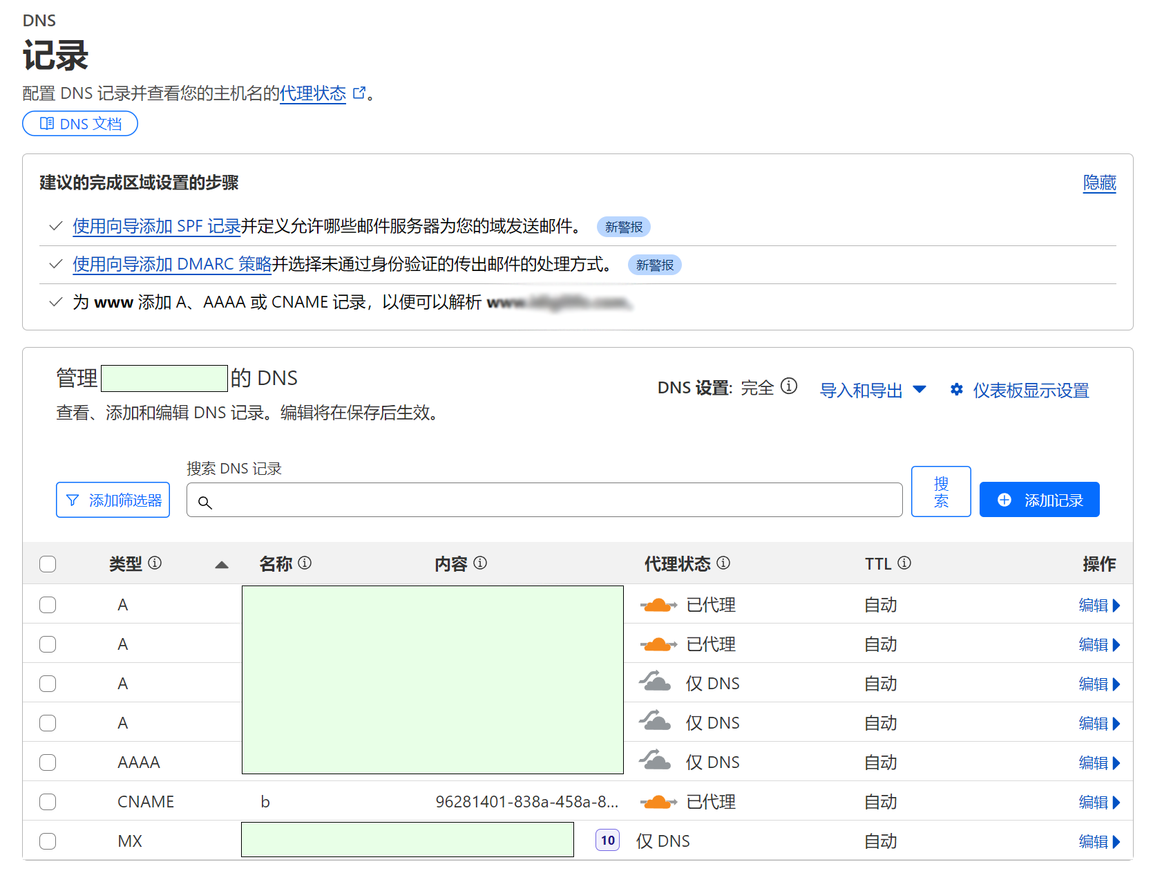 这时候,Cloudflare 会自动添加一条 CNAME 记录到对应的域名,如下图所示: